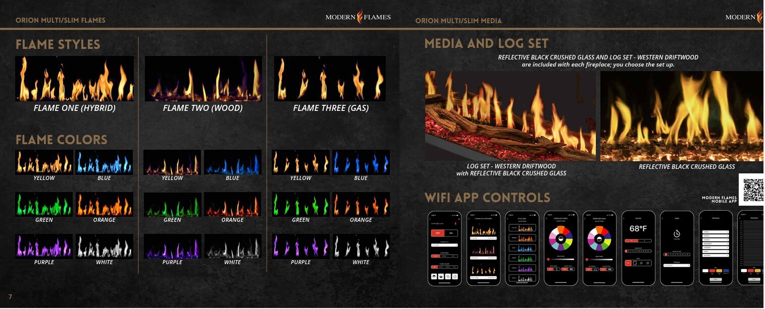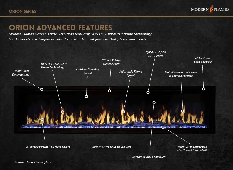 The Orion Slim uses optimized Heliovision™ Flame Technology to create randomized, multi-dimensional flames that look real from every angle. Three distinct flame patterns, six flame colors, adjustable flame speed, and multi-colored ember bed and downlighting let you alter the ambiance whenever you’d like. With 18 possible color combinations, it’s easy to design a color scheme that matches your home décor. State-of-the-art virtual technology also enables you to download new flame patterns, colors, and sounds, as they become available from Modern Flames. This means you’ll be able to continually upgrade your fireplace with the latest features at no extra cost.