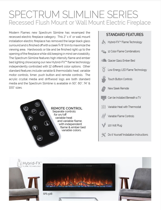Minimalist in both design and installation, the Spectrum Slimline Electric Fireplace - 50" by Modern Flames creates a luxurious gathering spot for any home or commercial space. The Slimline features a linear, zero-clearance design that can be mounted directly to a wall or recessed for a clean, flush finish. If you recess your Slimline, you’ll be able to install the hardwood or tile of your choice down to the glass opening for custom, streamlined style. For wall-mounted installations, the Slimline comes with a slender frame that won’t distract from its impressive viewing area.