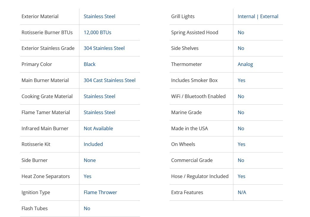 - Grill manufactured of premium black 304 stainless steel and backed with a limited lifetime warranty to assure you have a lifetime of grilling satisfaction